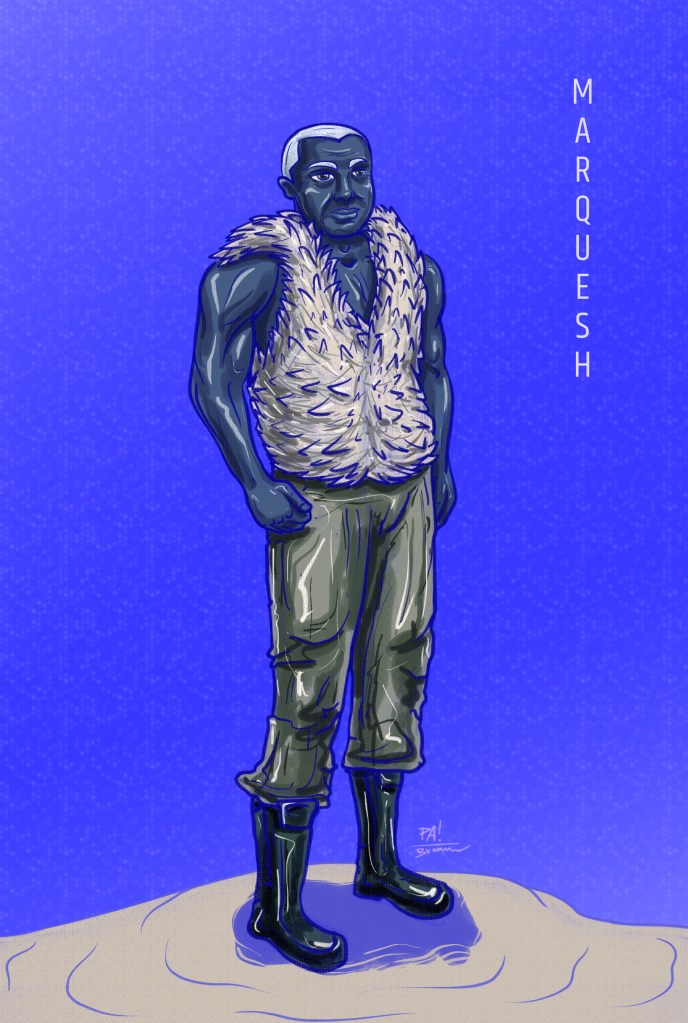 Marquesh: The Drontas partriarch stepped in front of her field of vision. His silver-white hair contrasted with his black skin. A vest of white fur covered his big, muscled body. The Drontas’ talent was their physical strength.